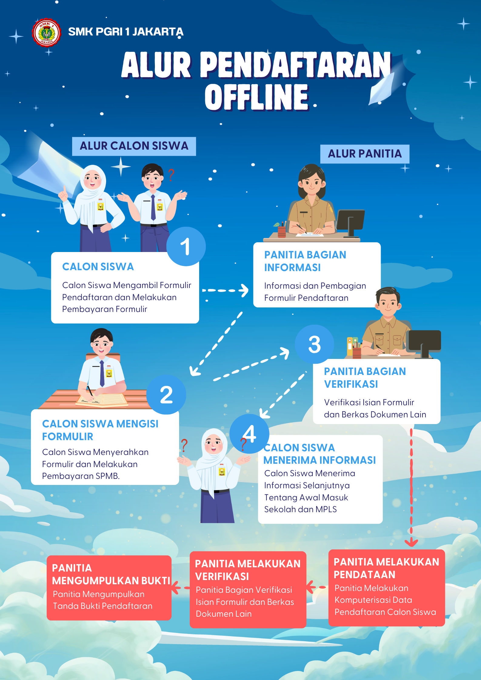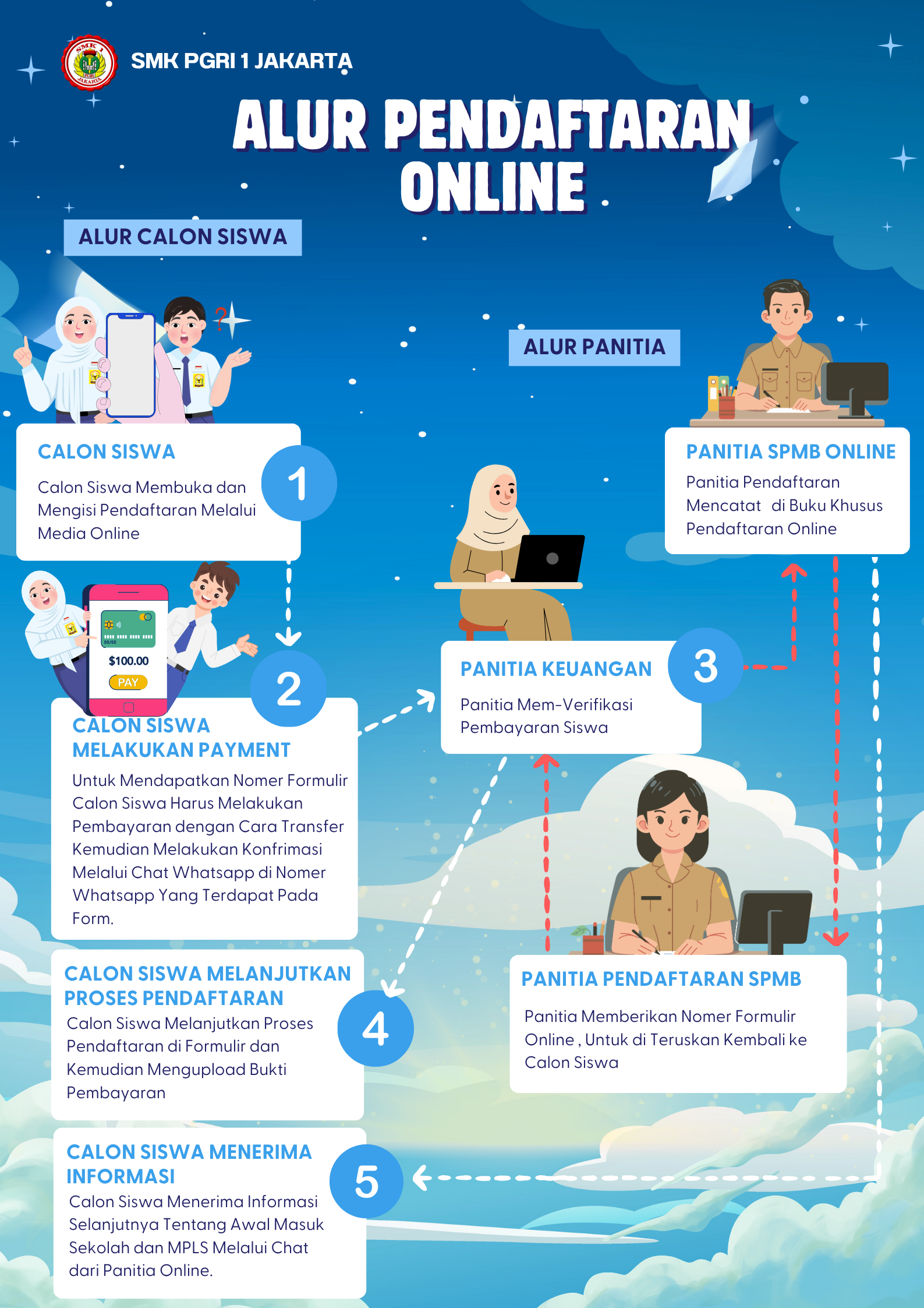1.Calon peserta didik mengunjungi website https://smkpgri1jkt.sch.id/admission/procedure atau https://linktr.ee/infosmkpgri1jkt